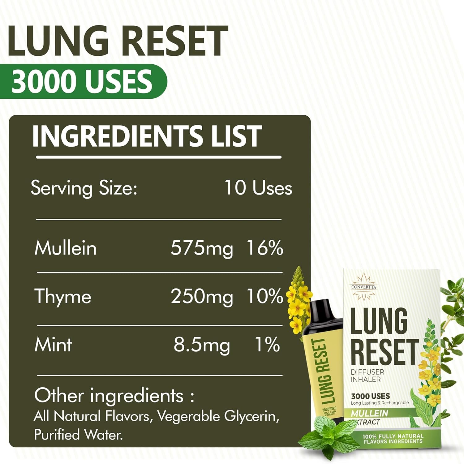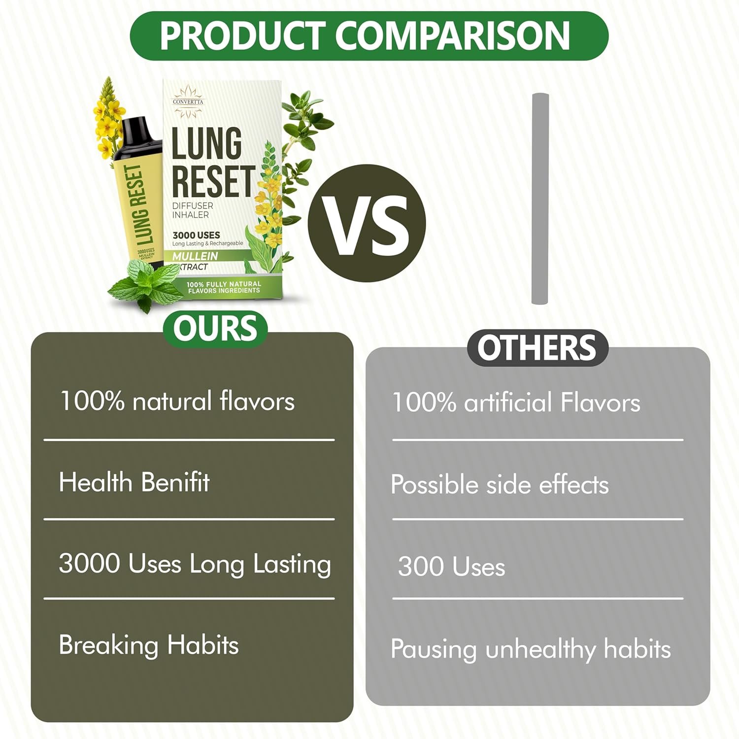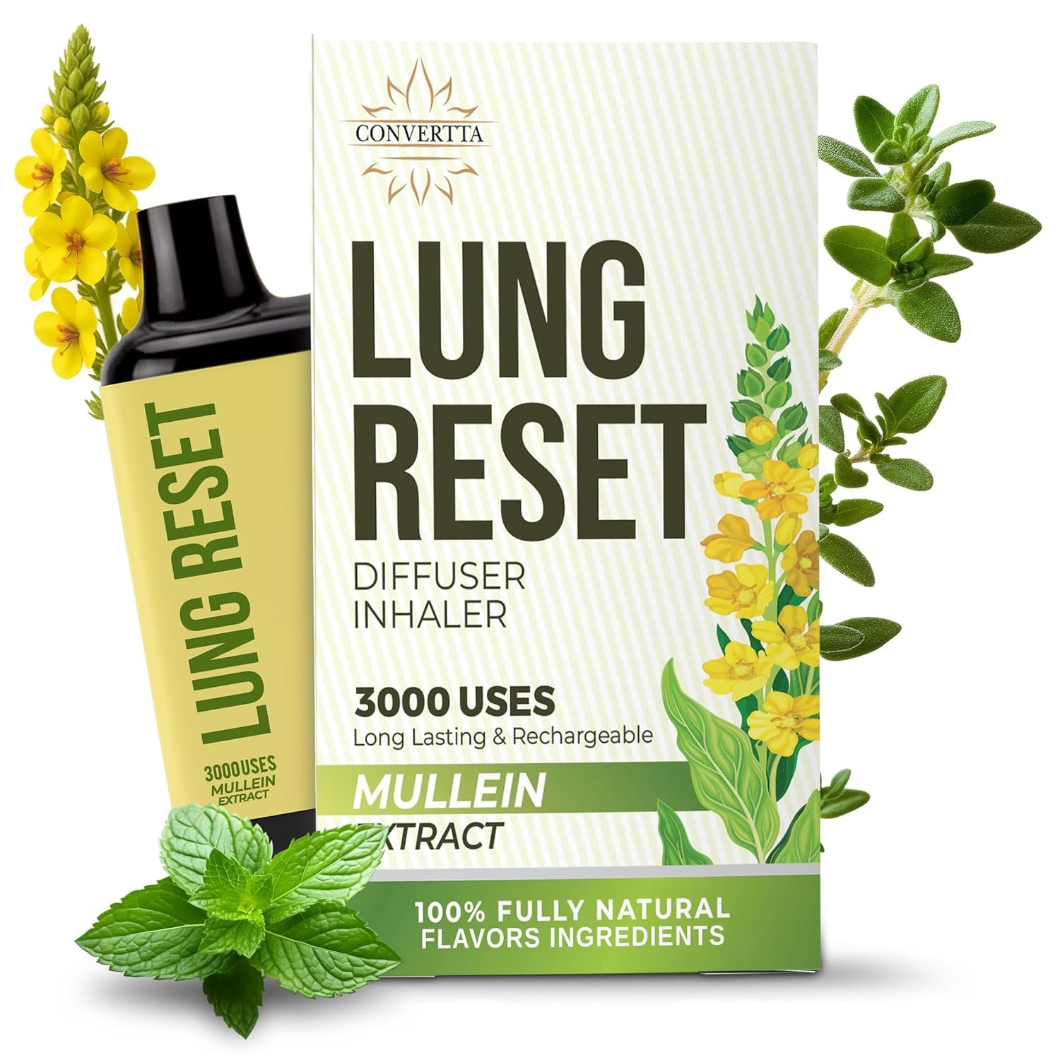 - Over 3000 Uses: The Converta Rechargable Natural Mullein Diffuser Pen was made to break bad habits with enjoyment and ease, we made sure you would get your monies worth and have the Mullein Diffuser Pen for weeks and not days, so we made sure you have over 3000 uses unlike others with less than 300 uses.